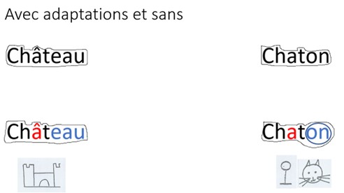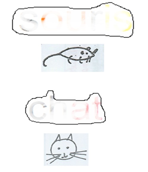 La méthode Aloé le permet. Les élèves mémorisent visuellement en globale la forme du mot puis, grâce au code couleur des voyelles, ils peuvent affuter l’empreinte mnésique qu’ils ont de ce mot. Cela fonctionne aussi bien en codage qu’en décodage. Par exemple de ces 2 mots : le mot « chat » a une forme assez caractéristique, en globale il sera possible de l’acquérir. Le mot « souris » quant à lui n’a pas une forme très reconnaissable. Grâce au code couleur Aloé, les jeunes peuvent aussi se souvenir des couleurs associées au mot et c’est déjà 3 lettres de moins à mémoriser. Nous voyons la différence aussi avec des mots proches graphiquement et identiques en lecture labiale. « Château » et « chaton » ont des sens totalement différents et une confusion est rapidement possible. Avec le code aloé ils peuvent voir où se situe la différence et cela aide leur empreinte mnésique (cf. Annexe 3).
