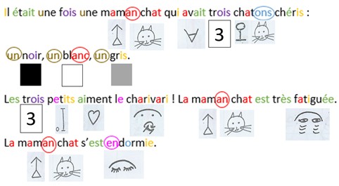 Le même texte que précédemment est utilisé comme exemple (cf. Annexe 2) avec les pictogrammes du centre Daviel/Robert Laplane en soutien. C’est un centre ressource, avec qui nous avons travaillé en collaboration. Le but est d’apporter des étayages pour petit à petit préparer le dé-étayage : progressivement enlever les pictogrammes d’abord, puis les couleurs. Pour ce profil, lire en mettant un sens sur un mot prend plus de temps et il lui faut plus d’effort pour y parvenir. Un travail de parole est à mener en parallèle pour l’aider dans sa production et sa réception de l’oral. Pour travailler la compréhension des textes avec ce profil, nous utilisions Narramus.