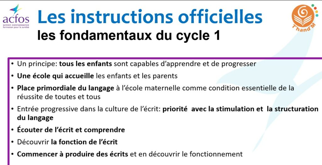 Figure 2 : les instructions officielles ; les fondamentaux du cycle 1 ; diapositive présentée au colloque