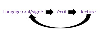 L’une des pratiques utilisées en classe actuellement au sein de nos dispositifs est de provoquer des situations concrètes d’expressions, de discours à partir d’éléments vécus ( une sortie, les vacances…)ou d’un support ( albums de jeunesse, affichage, listes de courses…), de porter à l’écrit ce discours et d’ainsi opérer la boucle suivante :