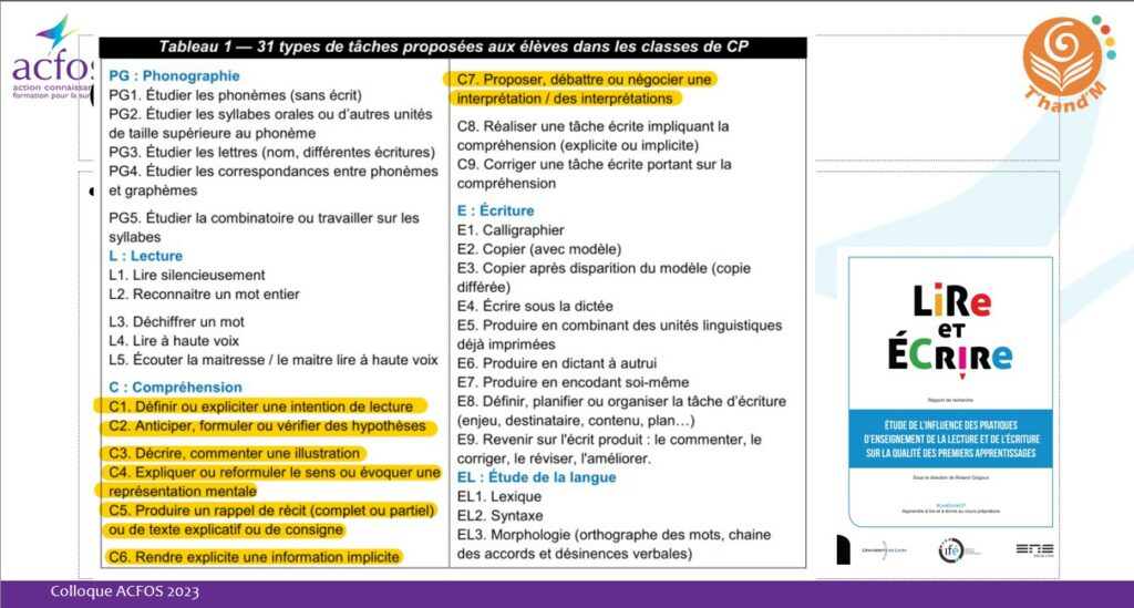 Figure 5 : écrire pour lire ; rapport de recherche de Roland Goigoux ; diapositive issue d’un document de travail de Hedi Fatnassi, enseignant spécialisé