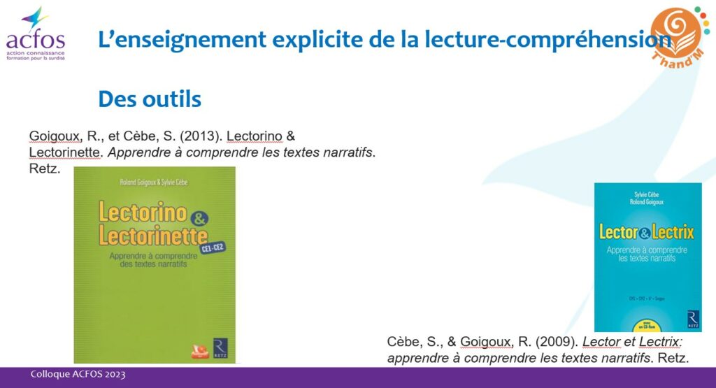 L’enseignement explicite de la compréhension de textes lus est outillé par Roland Goigoux et Sylvie Cèbe à travers les supports Narramus ou encore Lectorino & Lectorinette (et Lector & Lectrix).